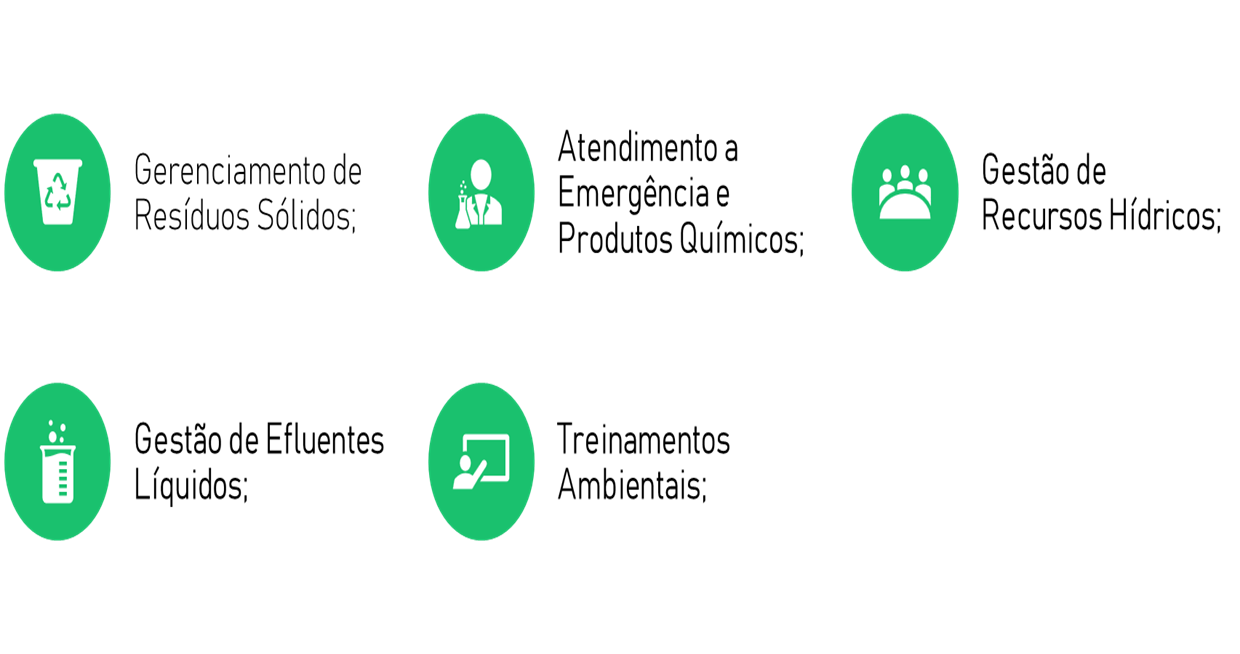 Treinamento ambientais com foco em resíduos sólidos e boas práticas; Plano de Atendimento a Emergência (PAE); Organização e atualização de Fichas com dados de segurança (FDS); Calendário Socioambiental com Campanhas ambientais relevantes; Implantação e acompanhamento da coleta seletiva;
